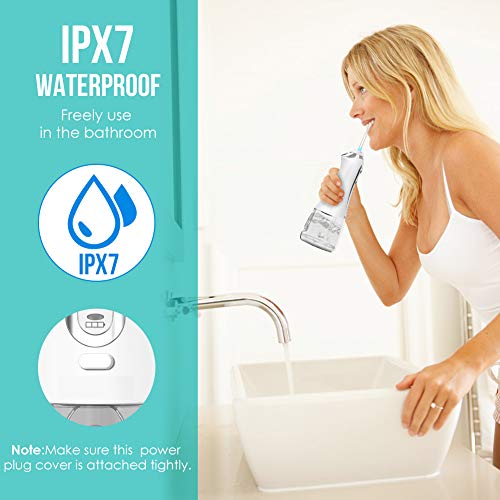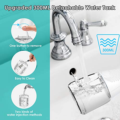 - 【IPX7 IMPERMEABLE Y FÁCIL LIMPIEZA】 -El tanque de agua mejorado desmontable y lavable de 300ML, contiene suficiente agua para 90-12 segundos de uso continuo del hilo dental y le permite limpiar a fondo la cal del interior. El diseño a prueba de agua IPX7 se adopta tanto en el interior como en el exterior para proporcionar una doble protección, puede usarlo con confianza al ducharse