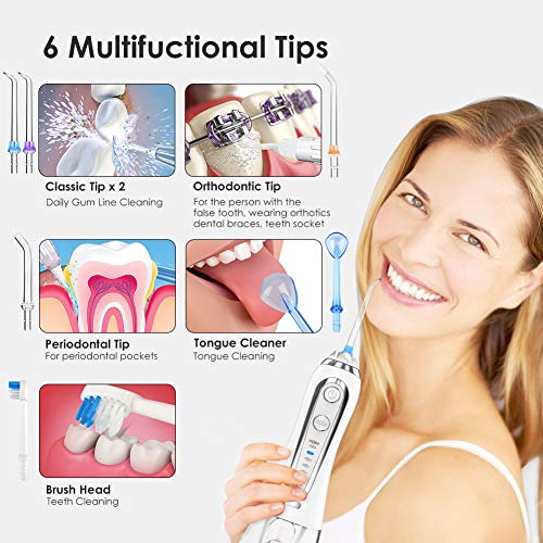 - 【IPX7 Impermeable y 6 Boquillas de Repuesto】El diseño resistente al agua IPX7, incluso puede usarlo en la ducha. Irrigador bucal viene con 6 boquillas. La boquilla puede limpiar cada esquina, eliminar la placa y los restos de comida, mantener sanos los dientes y las encías y ayudar a eliminar el 99.99% de las bacterias dañinas. para personas con implantes dentales, ortodoncia o placa dental.Todos pueden elegir la boquilla adecuada para sus dientes.