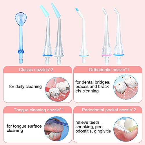 - ? 6 Boquillas de Repuesto ?: El paquete tiene un limpiador de lengua en el paquete y un cepillo de dientes. 4 boquillas estándar diferentes, cada boquilla estándar tiene diferentes funciones, dos para la limpieza interdental normal, una para la limpieza gingival, una para la limpieza ortodóntica. Todos pueden elegir la boquilla adecuada para sus dientes.