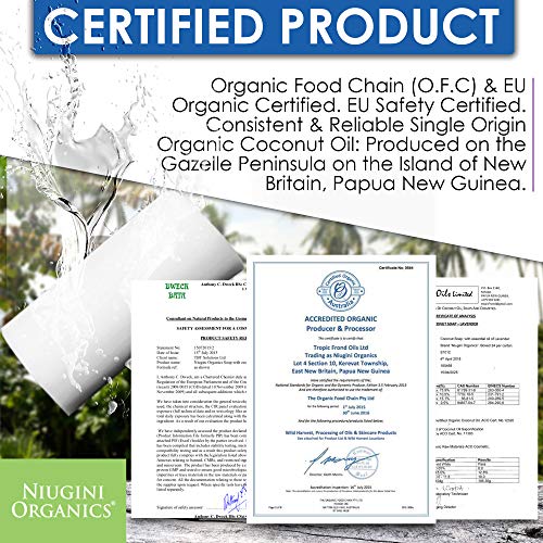 - ? HECHO DE ACEITE DE COCO PRENSADO EN FRIO, 100% ORGÁNICO, EN BRUTO, VIRGEN --- Cadena Alimenticia Orgánica (O.F.C.) y Certificado Orgánico de la UE. Aceite de coco de origen único, consistente y confiable: Producido en la Península de la Gacela en la Isla de Nueva Bretaña, Papúa Nueva Guinea. Sin refinar, desodorizar ni blanquear, Sin conservantes, Sin perfumes, Sin colorantes, Sin aceite de palma, Sin hidrogenar.