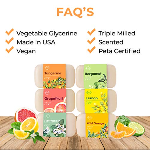 6 Pastillas de Jabón Natural Orgánico y Vegano Hecho de Aceite de Oliva y Coco con Vitamina C. Aroma Cítrico Fresco Varios. Jabón Manos, Cara y Cuerpo para Mujer y Hombre. Pastillas Jabón Ducha 680 gr