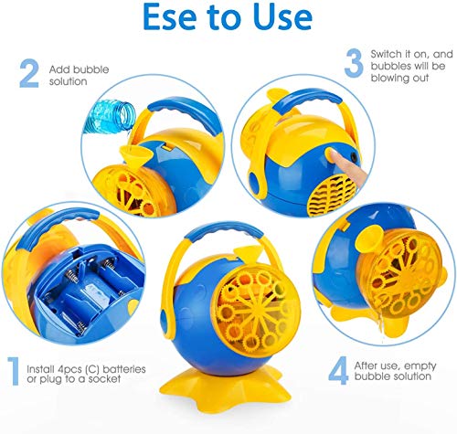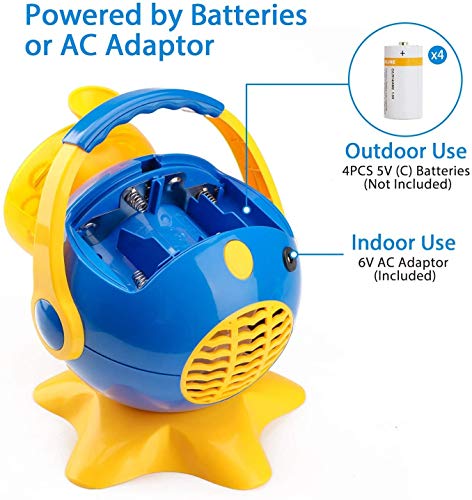 - 【Fácil de Usar & Transportar】: Coloque 4 baterías C 1.5V (no incluidas) o simplemente conecte la máquina de burbujas a la red eléctrica con el cable ofrecido, luego vierta líquido de pompas de jabon, presione el botón, eso es todo Tiene hermosas burbujas. Dos modos de energía le permiten usarlo en casa o en el exterior. Instale las baterías, lleve el asa, puedes hacer burbujas con tus hijos en todas partes.