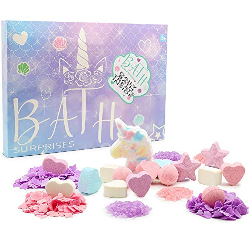 - ? SET REGALO DE 24 PIEZAS: Incluye 1 x bomba de baño grande con forma de unicornio, 7 x 30 g bombas de baño multicolor en forma de estrellas, cuadrados y corazones, 4 x 15g bolsas de jabón de confeti perfumadas, 4 x 15 g bolsas de sales de baño perfumadas. Seleccione uno o más productos cada día y transforme la hora del baño en una nueva aventura de agua perfumada con burbujas de jabón y musica relajante. Surtido de colores pastel.