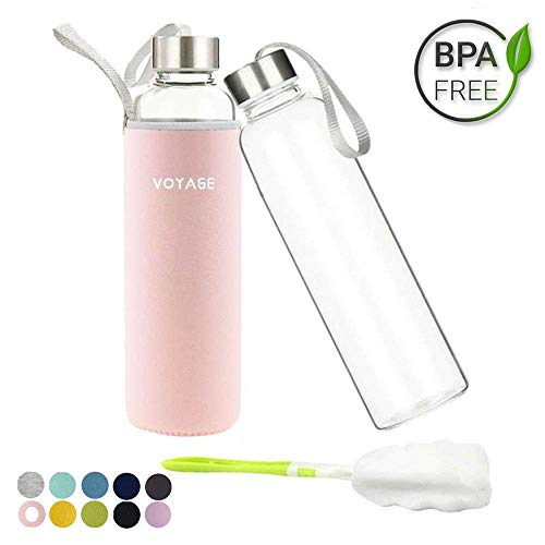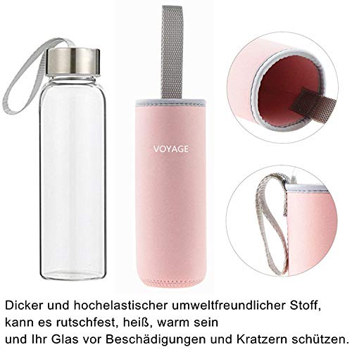 Voarge Botella de Agua Cristal 550ml, Botella de Agua Reutilizable 18 oz, Sin BPA Antideslizante Protección Neopreno Llevar Manga y Cepillo de Esponja, Rosa