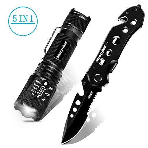 morpilot Navaja y Linterna Set, Cuchillo Supervivencia, Navaja Caza Pesca 85mm, Acero Inoxidble, Linterna LED de 5 Modos, 500LM, Impermeable IPX4, Portátil