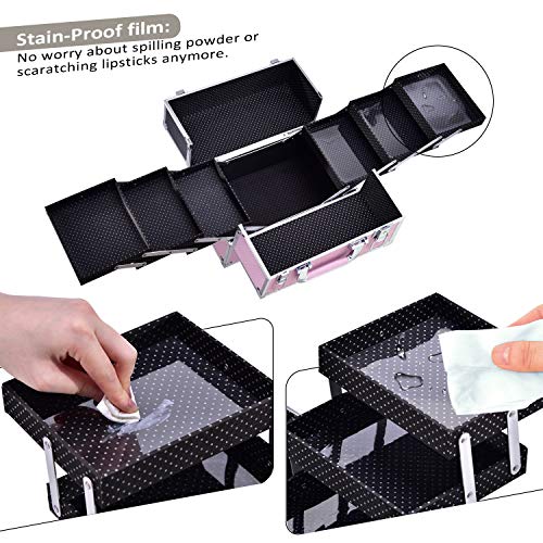 - ?【Seguro y protegido】 El estuche maquillaje adopta el estilo de diseño clásico, y sobre esta base, la protección de la tira de aluminio se instala en el lugar de uso frecuente, y la almohadilla del pie de goma se instala en la parte inferior de maletín cosmético para evitar la fricción y prolongar La vida útil del estuche maquillaje