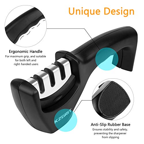 KZGRIT Afilador de Cuchillos, Ayuda a Reparar, Restaurar y Pulir Cuchillas, Afiladores Manuales Profesional de 3 Etapas con Mango Ergonómico & Base Antideslizante (Negro)