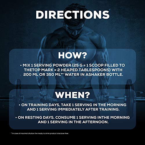 - Mezclar 1 dosis (25 g = 1 cuchara medidora llenada hasta la marca superior = 2 cucharadas soperas colmadas) con 200 ml o 350 ml** de agua en un shaker. (**En el caso de la dilución máxima, la bebida lista para beber es libre de lactosa.) En días de entrenamiento tomar 1 dosis por la mañana y 1 dosis justo después del entrenamiento, en días de descanso tomar 1 dosis por la mañana y 1 dosis por la tarde.