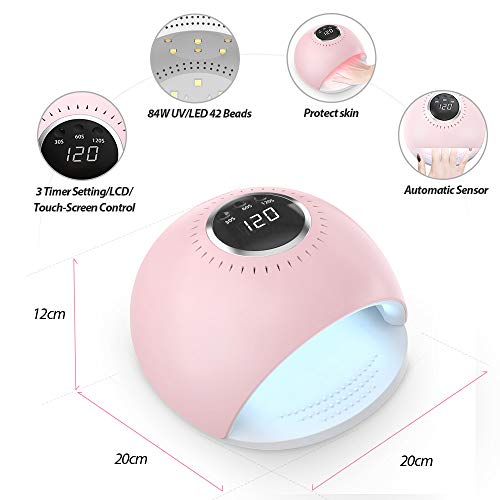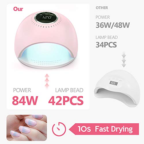 - ? 84W Lámpara Secador de Uñas ? : Lámpara LED UV para uñas tiene una potencia de 84 W, seca el gel para uñas en 5-10 segundos y acorta el tiempo de curado en más del 80%. Proporciona una experiencia de uñas rápida y perfecta. El tiempo depende del grosor y el material del gel para uñas.