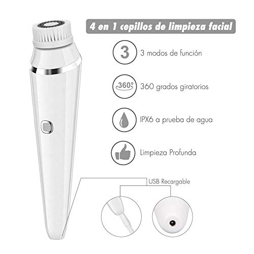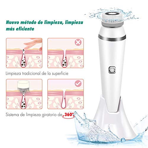 - 【Con 4 cabezales de cepillo de diferente eficacia】 Cabezal de cepillo de fibra súper suave, cabezal de cepillo exfoliante, cabezal de cepillo de silicona y cabezal de masaje giratorio. Se puede cambiarse en cualquier momento y puede eliminar eficazmente el maquillaje, la aceite facial, la suciedad, las cutículas, la piel muerta, los puntos negros, el acné, las callosidades y más, al tiempo tiempo para hacer la piel firme y elástica.