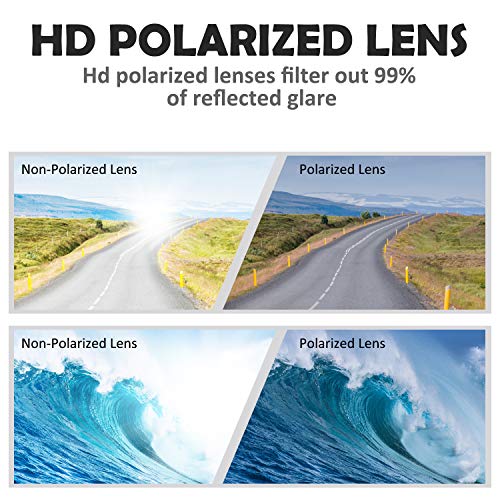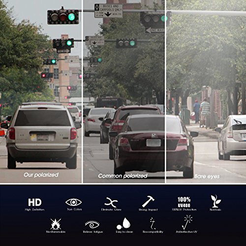 - UV400 Y LENTES POLARIZADAS. UV400 bloques de revestimiento de protección 100% perjudiciales rayos UVA y UVB. Lentes polarizadas reducen el deslumbramiento reflejado fuera de carreteras, cuerpos de agua, nieve y otras superficies horizontales. Restaurar True color, eliminar la luz reflejada y dispersa la luz y proteger los ojos perfectamente.