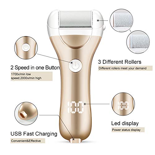 Lima para pies eléctrica, removedor de piel dura recargable por USB, callos para pedicura de pies con 3 rodillos y 2 velocidades, y 1 cepillo de limpieza (Oro)