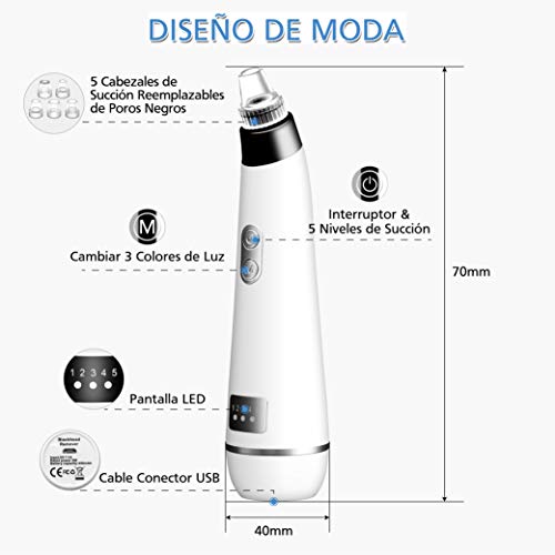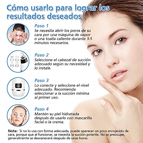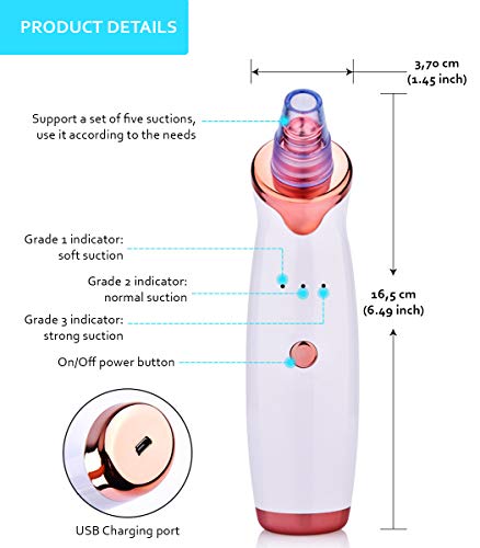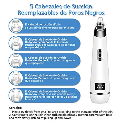 - 【5 Niveles de Succión】 - Ajustar la fuerza de succión según su necesidad, la fuerza de succión mínima es adecuado para la piel sensible, 2-3 nivel se utiliza para el control de aceite y la eliminación de polvo, 4-5 nivel es la más fuerte, ayudando a eliminar los puntos negros obstinados.