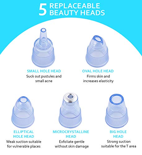 - 【5 CABEZALES DIFERENTES】Proporcione 5 cabezales extraíbles para satisfacer diferentes necesidades. Elija diferentes cabezales para diferentes áreas faciales y problemas faciales, incluida espinillas, acné, grasa, exceso de córnea, piel muerta y residuos de maquillaje. Lea las instrucciones o contactarnos si no sabe cómo usarlo.