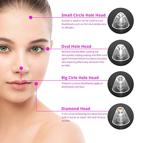 - ✔ 4 CABEZAS FUNCIONALES INCLUIDAS - Incluyendo 1 x Cabeza de orificio circular grande para una fuerte succión, 1 x Cabeza de orificio circular pequeña con suave succión para el área sensible de la piel, 1 x Cabeza de orificio ovalada para una mejor remoción de la cabeza de la nariz, 1 x Cabeza microcristalina para exfoliación de piel muerta .