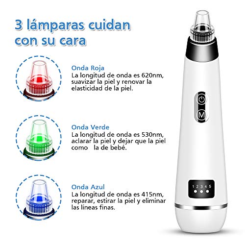 - 【5 nivel de potencia y 3 lámparas de belleza】Puedes ajustar su fuerza de succión con 5 niveles para que se adapte a tu tipo de piel y tamaño de los poros.El cambio de nivel también se muestra en la pantalla LED. Además, las 3 luces de belleza multifuncionales de 3 colores (rojo / verde / azul) ofrecen diferentes longitudes de onda (620/530/415 nm), ayudan a regenerar, aclarar y reparar la piel.