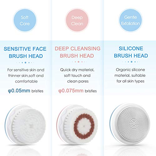 - ? 3 modelos diferentes y recordatorio Inteligente - Un cabezal de cuidado suave, un cabezal de limpieza profunda y un cabezal silicona que ofrecemos, puede obtener múltiples opciones para adaptarse a su piel. La función del temporizador inteligente se desacelera ligeramente cada 20 segundos para recordarle a cambiar las áreas, se apaga después de 1 minuto: se asegura que no haga demasiada limpieza.