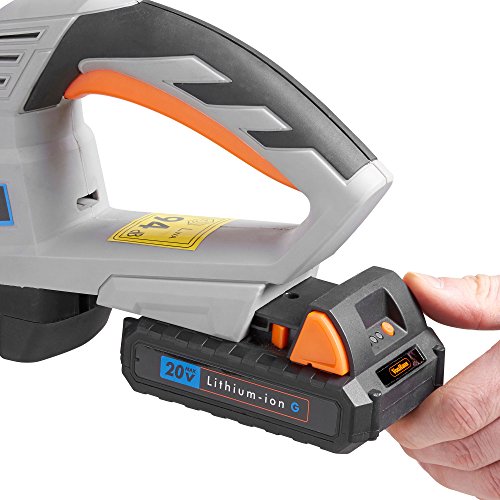 - La batería del cortasetos es completamente compatible con todos los otros productos en la gama 20 V Máx. de Iones de Litio G de VonHaus. El producto es de color negro, naranja y gris.