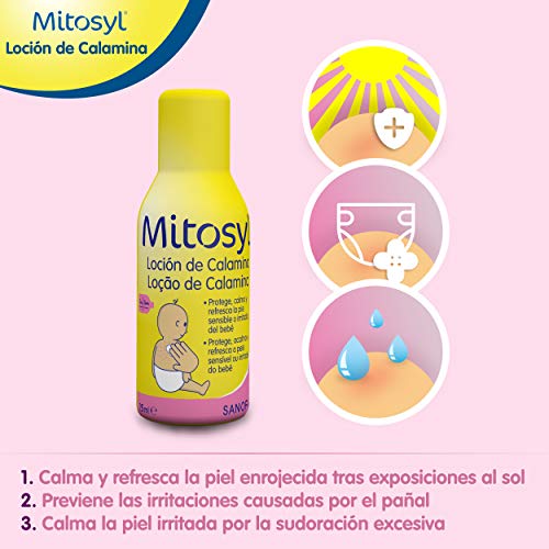 - Mitosyl Loción Calamina calma y refresca la piel enrojecida tras exposiciones al sol y sudoración excesiva en bebés