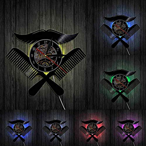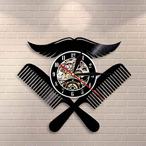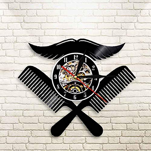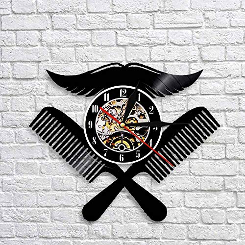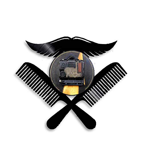 WAGUZA Reloj de Pared con Logotipo de peluquería, diseño de Interiores de salón de peluquería, Reloj de Disco de Vinilo, Bigote con peines, decoración de Pared para peluquería