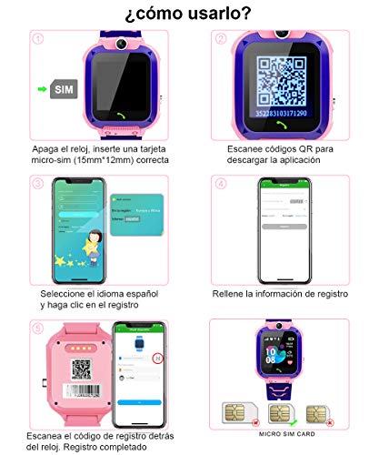 - 【NOTAS】:1.Este smartwatch niños soporta sudor, chorros de agua y polvo. NO APTO PARA NATACIÓN, NI DUCHARSE. 2. Con la tecnología LBS (NO GPS), puede saber la ubicación aproximada, puede tener un error de 0.3-4 km. 3. Este reloj inteligente niños admite tarjetas Micro SIM (no incluida) de redes 2G (no apto 3G y 4G)(si no sabe donde puede comprar tarjeta sim 2G, puede buscar “tarjeta sim 2g” en amazon, hay muchos resultados.) Recomendamos el uso de Movistar, Jazzinternet, Orange.