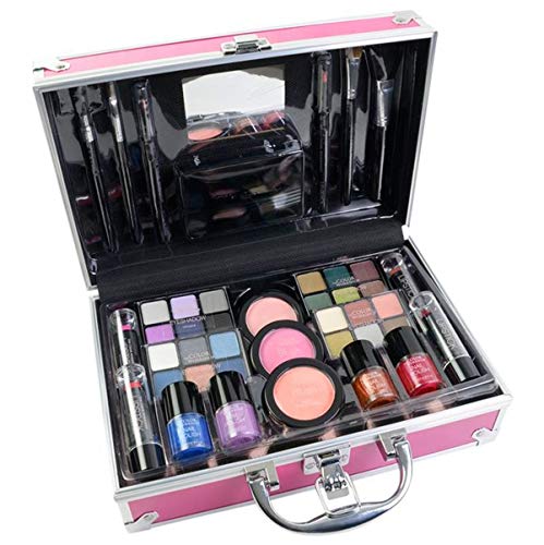 - NO FALTA NADA - 1 maletín rosa con espejo, 24 tonos de sombras de ojos, 3 tonos de colorete, 4 tonos de esmalte de uñas, 4 lápices de labios y 6 pinceles de maquillaje
