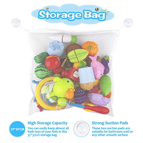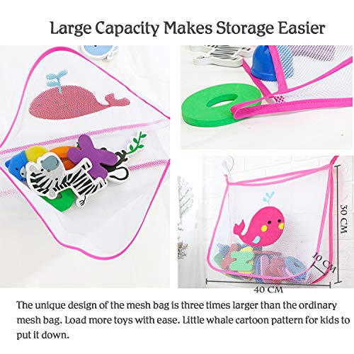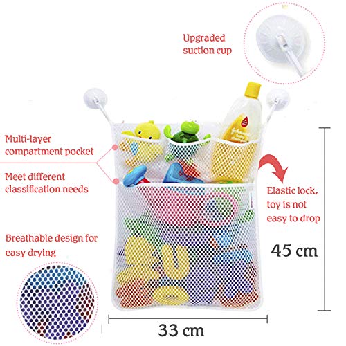 - ?ā?ćMalla de AlmacenamientoćPuede guardar fĆ”cilmente casi todos los juguetes de baƱo de su bebĆ© en esta bolsa de almacenamiento de 37 * 37 cm. Las dos ventosas que tienen alta fuerza de succión son adecuadas para la pared del baƱo y cualquier superficie lisa.