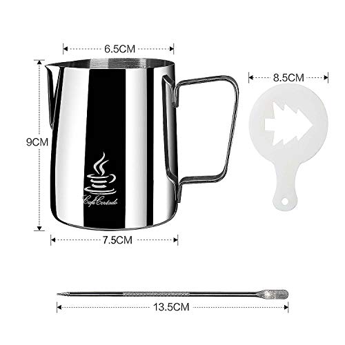 Jarra de Leche de Acero Inoxidable 304, FlamGen 350ml (120z) Taza de Leche para Espuma de Leche Jarra con Marca de Medición | Lápiz Artístico de Leche | 15 Piezas Plantillas de Café Cappuccino y Latte