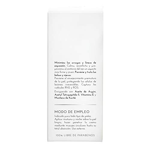 - ELABORADO CON INGREDIENTES NATURALES DE ORIGEN VEGETAL como sus principales activos hidratantes y nutritivos: Aceite de Argán y Manteca de Karité. Regenerador, nutre y suaviza el contorno de los ojos.