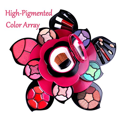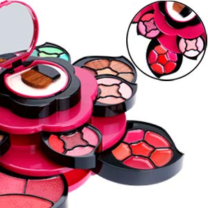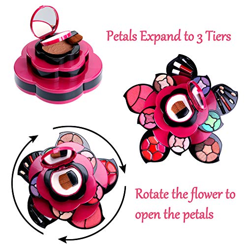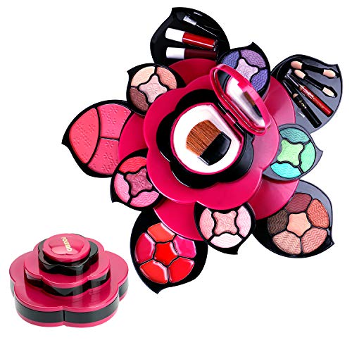 - DISEÑO DE FLORES HERMOSAS: carcasa de diseño floral exclusivo con pétalos que se expanden para revelar 3 niveles de maquillaje de alta calidad. Fresca combinación de color rosa fuerte y negro