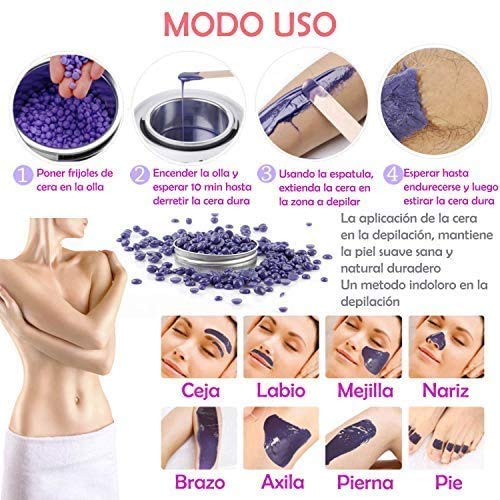 - 1【cera depilatoria Materiales seguros y naturales】 Nuestro calentador de cera ha sido probado de manera segura para la piel y puede eliminar el vello no deseado, las axilas, el área del bikini, la cara, el labio, las cejas, los brazos y las piernas. Deja la piel suave.