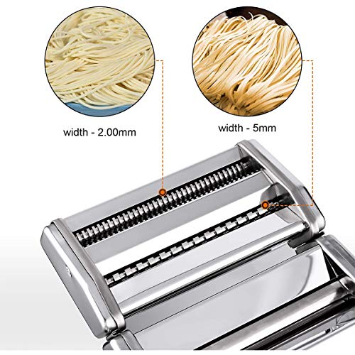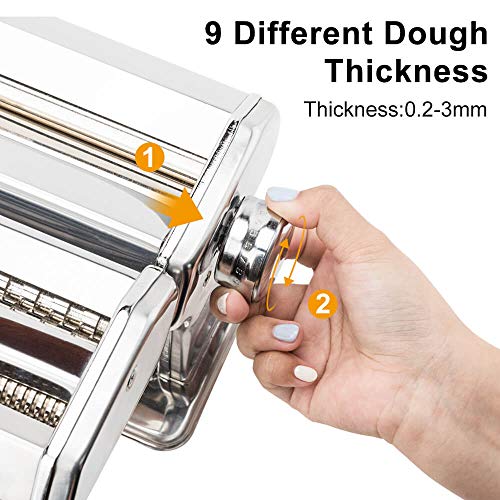 - 【Ancho de corte ajustable】 Hay 2 cuchillas de corte de acero inoxidable: 2.0 mm (fideos) /4.5 mm (espagueti) y 7 configuraciones diferentes de grosor de masa (0.5-3 mm), utilizadas para pastas de diferente grosor y Amasar y aplastar.
