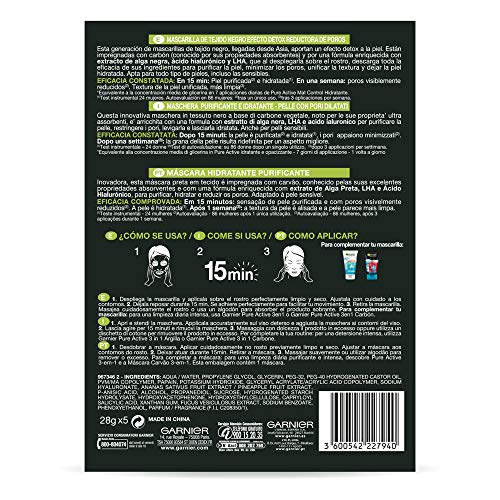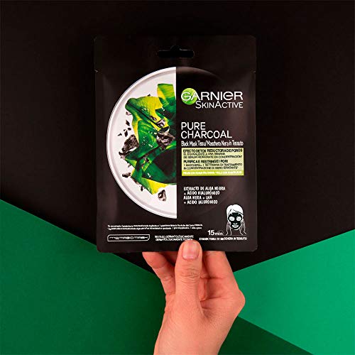Garnier Skin Active - Black Mask Tissu Pure Charcoal, mascarilla de tejido con carbón y extracto de alga negra para pieles con poros dilatados, 5 unidades