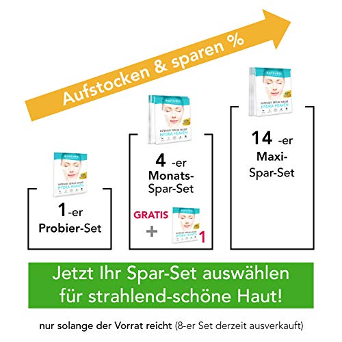 Mascarillas faciales KONIVÉO Premium. Máscara de tejido con sello alemán Dermatest „Muy bueno“. Tratamiento de hidratación intensa para el rostro con Ácido Hialurónico. Pack mensual 4 Unidades