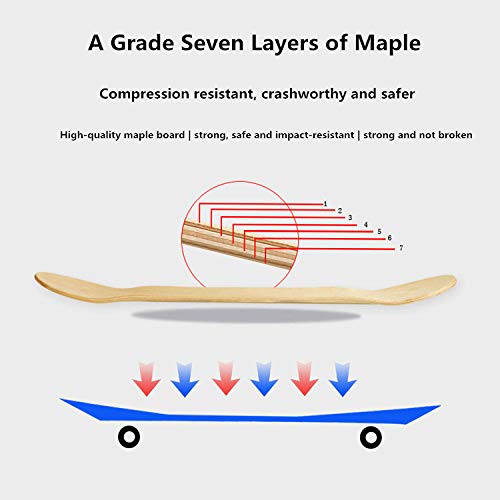 - ♣ Robusto y sólido: el patín completo de 31 "x 8", la plataforma de madera de arce canadiense de 8 capas combina con camiones de aleación de aluminio reforzado de 5 pulgadas que le brindan un soporte sólido y confiable. El peso máximo de carga de la patineta es de hasta 220 libras.