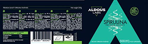 - SUPERALIMENTO PARA VEGANOS Y VEGETARIANOS - La Spiruline Bio Aldous es un producto idóneo para complementar dietas veganas o vegetariana porque no contiene gelatina animal, gluten, leche, lactosa ni ingeniería genética. Todos nuestros productos son orgánicos, son respetuosos con el medio ambiente, son producidos honestamente sin utilizar ingredientes de origen animal, y son económicamente sostenibles