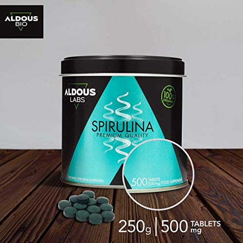 - FUENTE DE PROTEÍNA VEGETAL DE CALIDAD - La spirulina Aldous Bio contiene en cada comprimido un 99% de espirulina en polvo que proporciona proteína vegetal de altísima calidad. Como el origen de nuestra alga spirulina es 100% natural y ecológico, nuestro organismo la reconoce y asimila en mayor grado sin crear reacciones adversas. Nuestro formato de 500 comprimidos de 500mg facilita y agiliza el consumo durante 165 días.