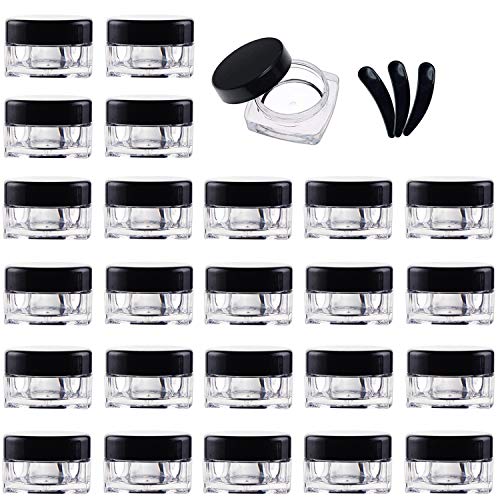 Yalbdopo - Juego de 25 tarros de plástico vacíos para cosméticos con tapas de rosca negras, para crema, polvo, almacenamiento de maquillaje, incluye 3 mini espátulas