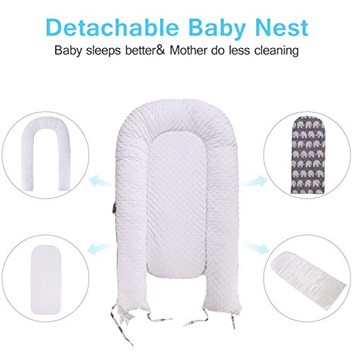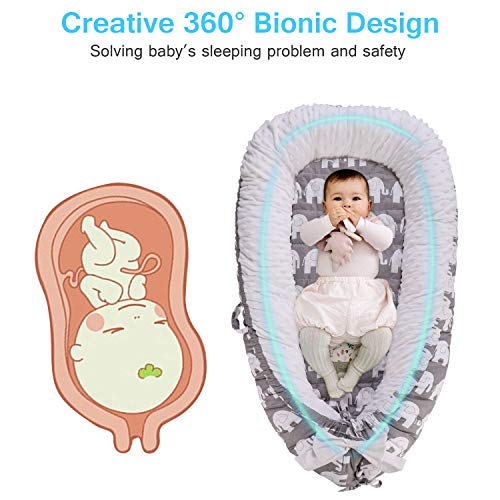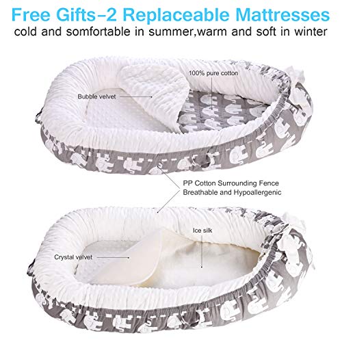 Nido para Bebés Recien Nacido Cama para Cuna biónica hipoalergénica de espuma de algodón suave y transpirable para recién nacidos con 2 colchones reemplazables (Gris/elefante)