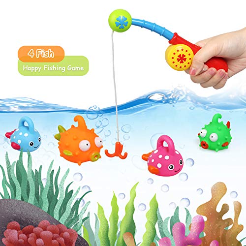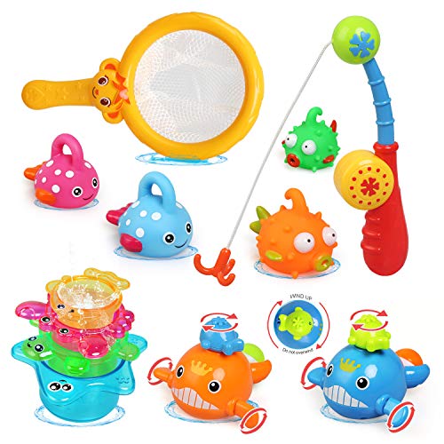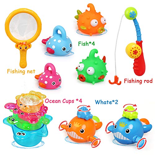 - ā ć15 PCS Juguetes de BaƱo BebĆ©ćEstos juguetes de baƱo para niƱos pequeƱos vienen con 1 red de pesca, 1 caƱa de pescar de juguete, 4 peces de diferentes colores, 2 ballenas de baƱo de cuerda, 4 tazas apilables con temas oceĆ”nicos. Colorido y juguetón, este juguete unisex es Un regalo ideal para el baƱo del bebĆ© tanto para niƱos como para niƱas.