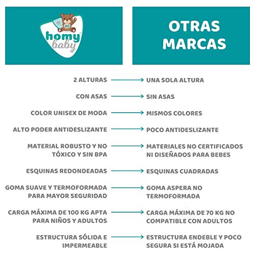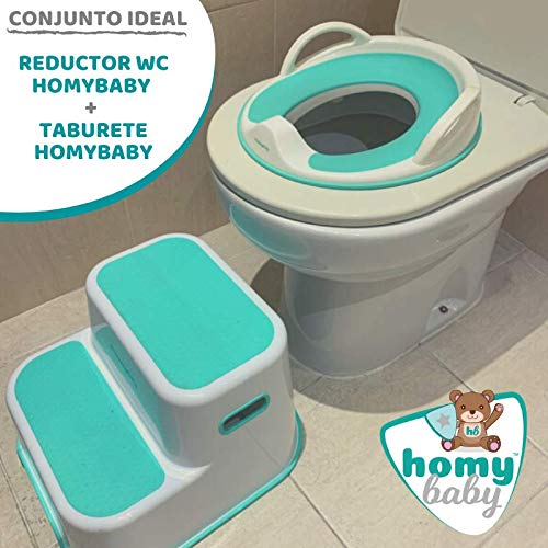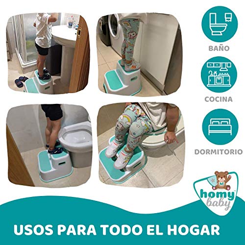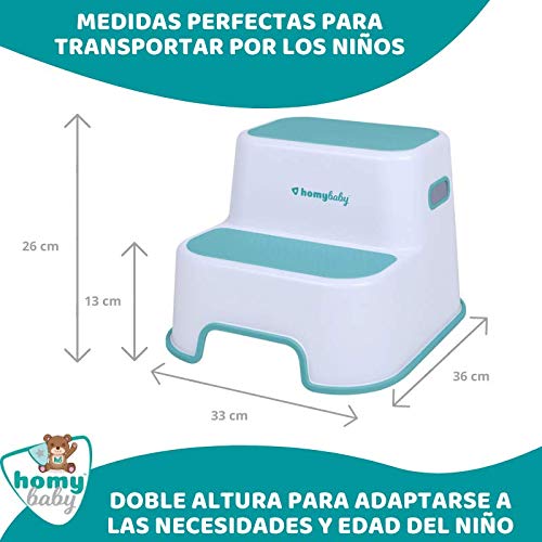 - ā SEGURO PARA NIĆOS ?? El taburete Homybaby es ideal para llegar a los lugares mĆ”s altos. DiseƱado con una base antideslizante reforzada para mayor seguridad, y con asas para facilitar su transporte, incluso por niƱos. Taburete con dos peldaƱos para adaptarse a las necesidades del niƱo, proporcionando una altura extra de 26,5cm. Uso recomendado a partir de los 18 meses de edad