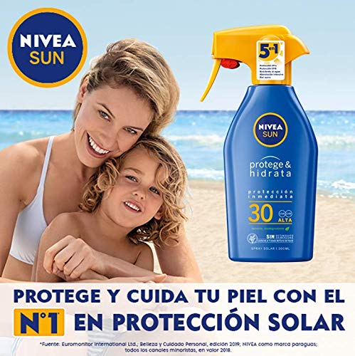 NIVEA SUN Protege & Hidrata Spray Solar FP30 (1 x 300 ml), protector hidratante y resistente al agua con protección UVA/UVB, protección solar alta en formato pistola