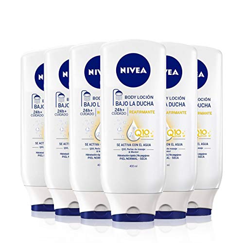 NIVEA Bajo la Ducha Loción Reafirmante Q10Plus en pack de 6 (6 x 400 ml), loción corporal para piel seca y normal, acondicionador de piel de rápida absorción