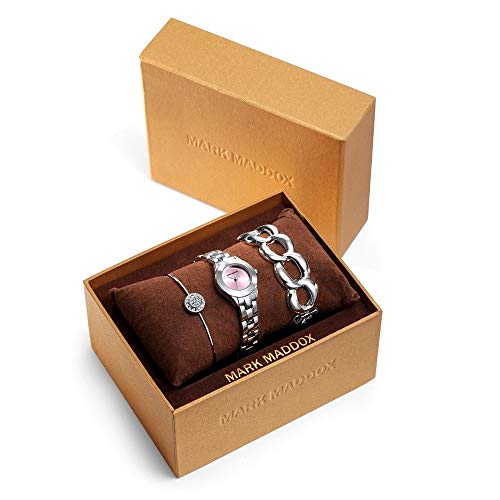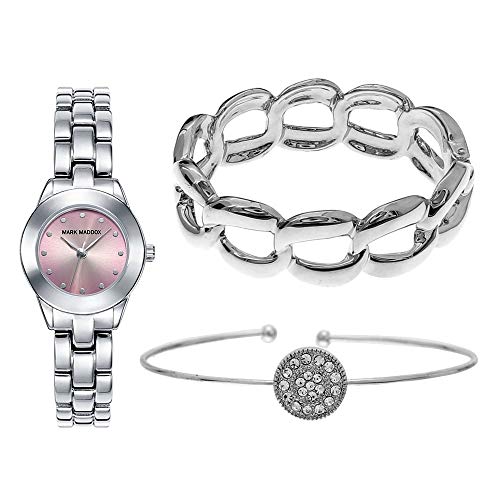- MARK MADDOX. 3 piezas. Pulsera rígida eslabones: ancho 22mm diámetro máx. interior 62mm. Pulsera rígida piedras blancas: ancho 1mm diámetro motivo: 12mm. diámetro máx. interior 62mm. Movimiento: Cuarzo. Diámetro caja(mm): 25. Material pulsera: Metal