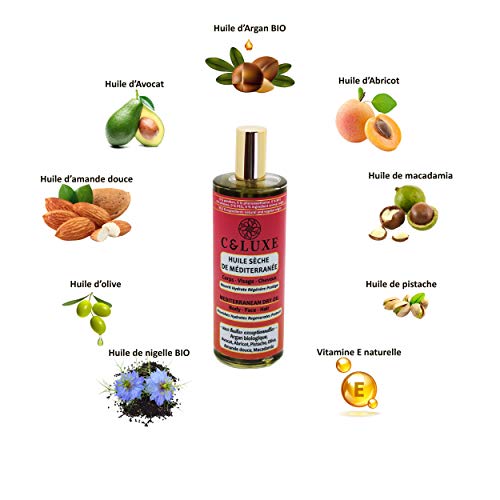 Aceite mediterráneo seco, CUERPO CARA CORPORAL, argán orgánico, aguacate, nutre hidrata, regenera y protege su piel, sin silicona, 99.5% natural, spray 100 ml.