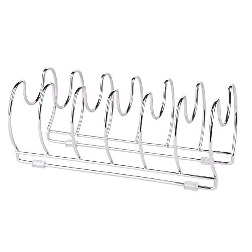 - SÓLIDO Y DURADERO: Realizado en resistente metal, este organizador sartenes es muy fuerte y soporta el peso de la batería de cocina y el uso diario. Los protectores de PVC evitan que los muebles de cocina se rayen o dañen.