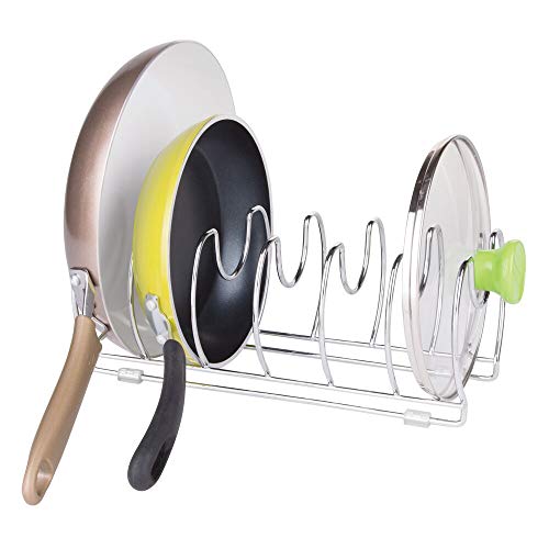 mDesign Organizador de sartenes y tapaderas – Soporte de metal cromado con 6 compartimentos para sartenes y tapas de ollas – Organizador de cajones y armarios de cocina