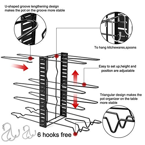 Organizador de ollas ajustable con 8+ ollas y sartenes Oragnizer, contador de cocina y soporte para tapa de armario con 3 métodos de bricolaje (6 ganchos incluidos)