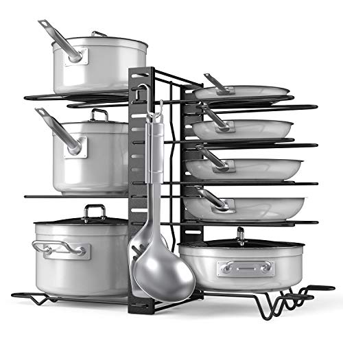 - Separadores ajustable: el organizador de sartenes viene con 8 niveles ajustables y regalo extra – 6 ganchos en forma de S de acero inoxidable enganchan de forma segura tus ollas, sartenes, cucharas. Altura y posición son diseño ajustable que te proporciona más opciones para organizar macetas con diferentes tamaños.