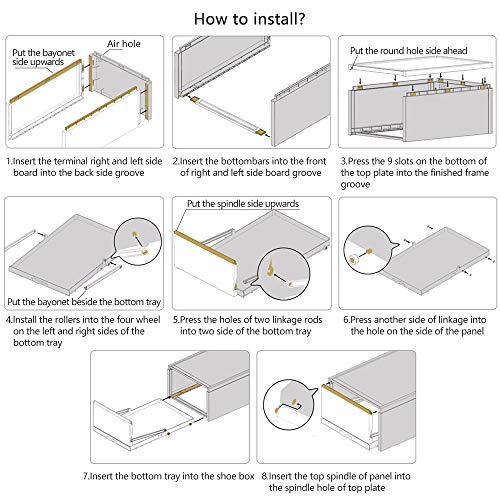 - Fácil de montar: con la ayuda de instrucciones, puede instalar la caja de zapatos rápida y fácilmente. Cuando no la use, puede separar la caja de zapatos y colocarla en la grieta o debajo de la cama. No afectará a la habitación con elegancia y ahorrará espacio.